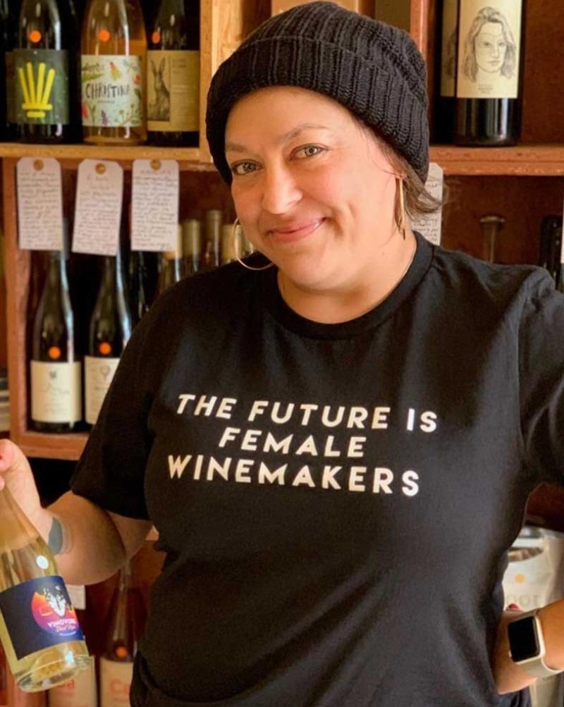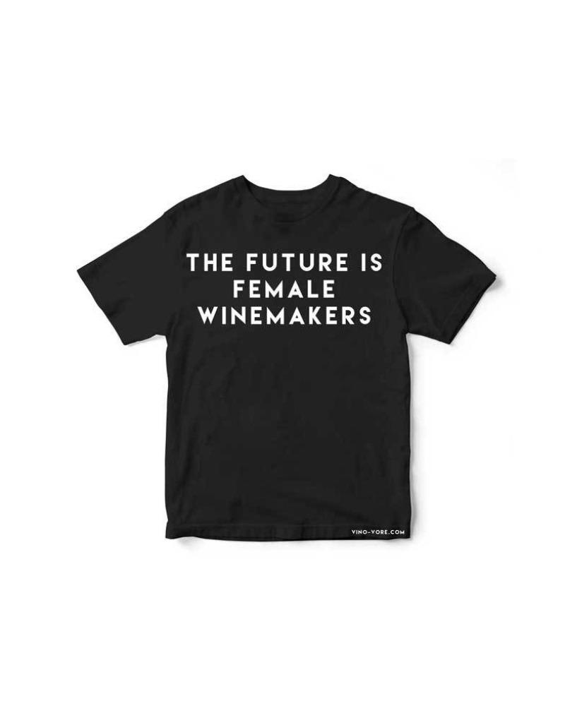 Vinovore's own "The Future Is Female Winemakers" t shirt. Text on front with logo on back. Black tee with white print. Unisex.